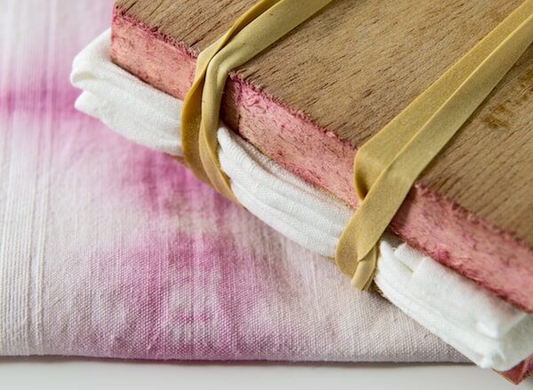 Piega il tessuto più volte nel senso della larghezza e quindi più volte nel senso della lunghezza. Inserisci il tessuto ripiegato tra due pezzi di legno e stringi forte con degli elastici. Immergi in un bagno di colorante. Trovi tutti i nostri tutorial e le nostre idee sui coloranti sul nostro blog IL BLOG DEI COLORI.